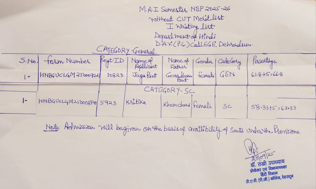 The Year 1892 witnessed the transfer of an Arya Samaj eveninig school from Meerut to the valley of Dehradun. That sapling grew and developed as D.A.V. School. Gradually growing, extending its branch it turned as Dayanand Anglo Vedic Post Graduate College, Dehradun in 1948 with the help of people like Thakur Puran Singh Negi who donated his entire immovable property to this educational institution. It nurtured well on the principles laid by Swami Dayanand and was also influenced by Anglo Education System. It has now emerged as one of the most famous premier institution of Northern India after independence and the biggest college of Uttarakhand State having all the five faculties viz. ARTS, SCIENCE, COMMERCE, B.Ed & LAW comprising twenty one disciplines.